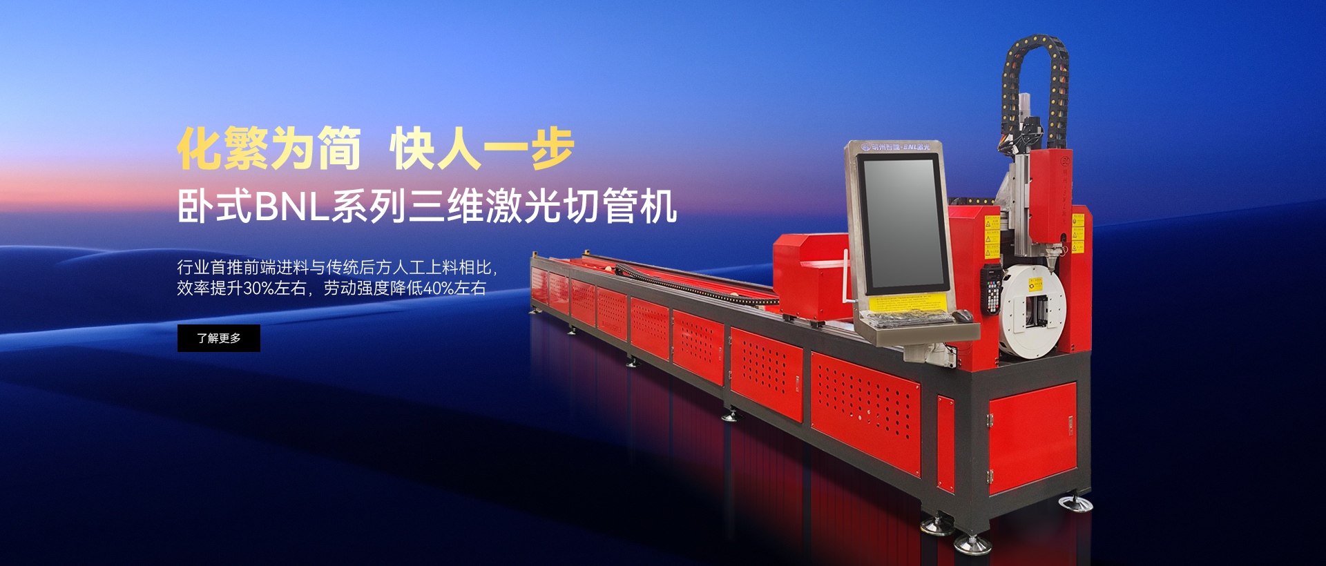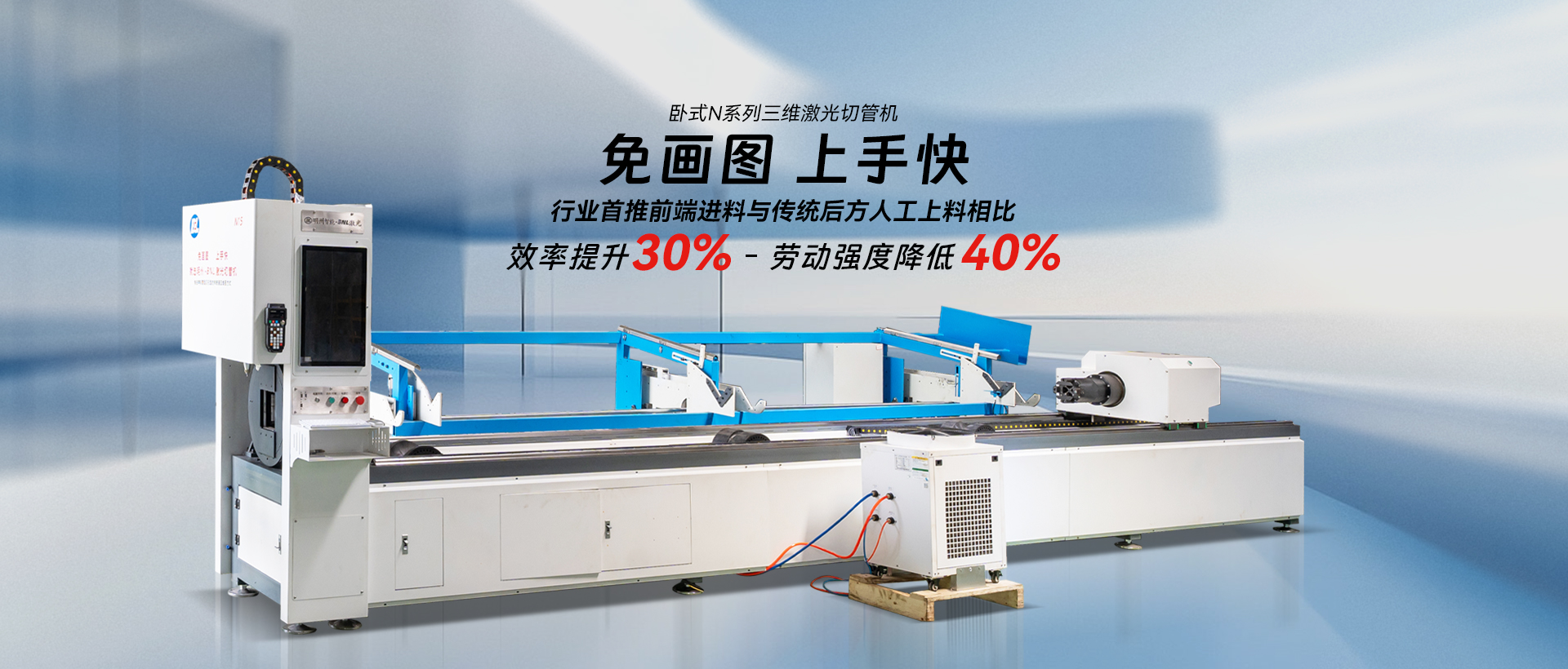 與傳統激光切管機從后面抬料上料相 比,效率提升約40%,勞動強度降低 約40%,大幅提高生產效率的同時, 顯著降低勞動強度。
