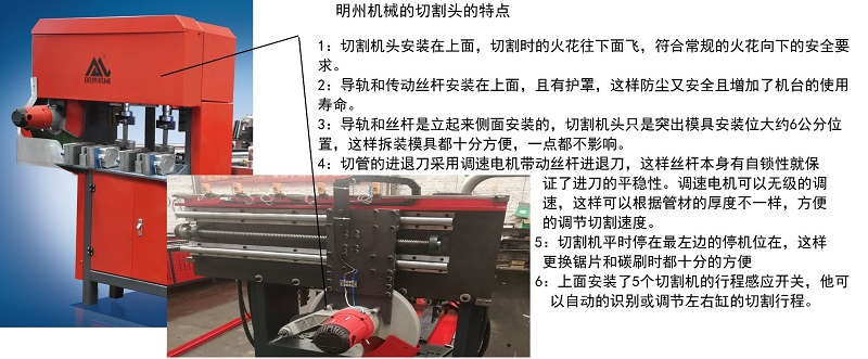 3:切割機的結構和安裝方式不一樣明州機械的切割機頭特點:1:切割機頭安裝在上面,切割時的火花往下面飛,符合常規的火花向下的安全要求。2:導軌和傳動絲桿安裝在上面,且有護罩,這樣防塵又安 全且增加了機臺的使用壽命。3:導軌和絲桿是立起來側面安裝的,切割機頭只是突出模具安裝位大約6公分位置,這樣拆裝模具都十分方便,一點都不影響。4:切管的進退刀采用調速電機帶動絲桿進退刀,這樣絲桿本身有自鎖性就保證了進刀的平穩性。調速電機可以無級的調速,這樣可以根據管材的厚度不一樣,方便的調節切割速度。5:切割機平時停在最左邊的停機位在,這樣更換鋸片和碳刷時都十分的方便6:上面安裝了5個切割機的行程感應開關,他可以自動的識別或調節左右缸的切割行程。7:切割機的前夾夾具采用雙導軌式安裝,可以隨時任意的隨管材大小來調節,十分的方便。