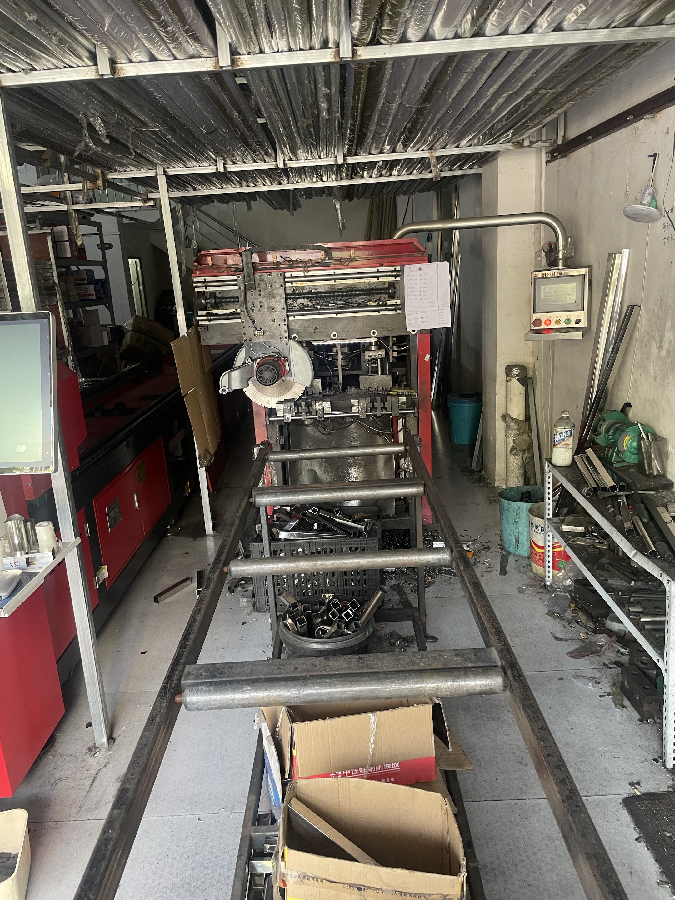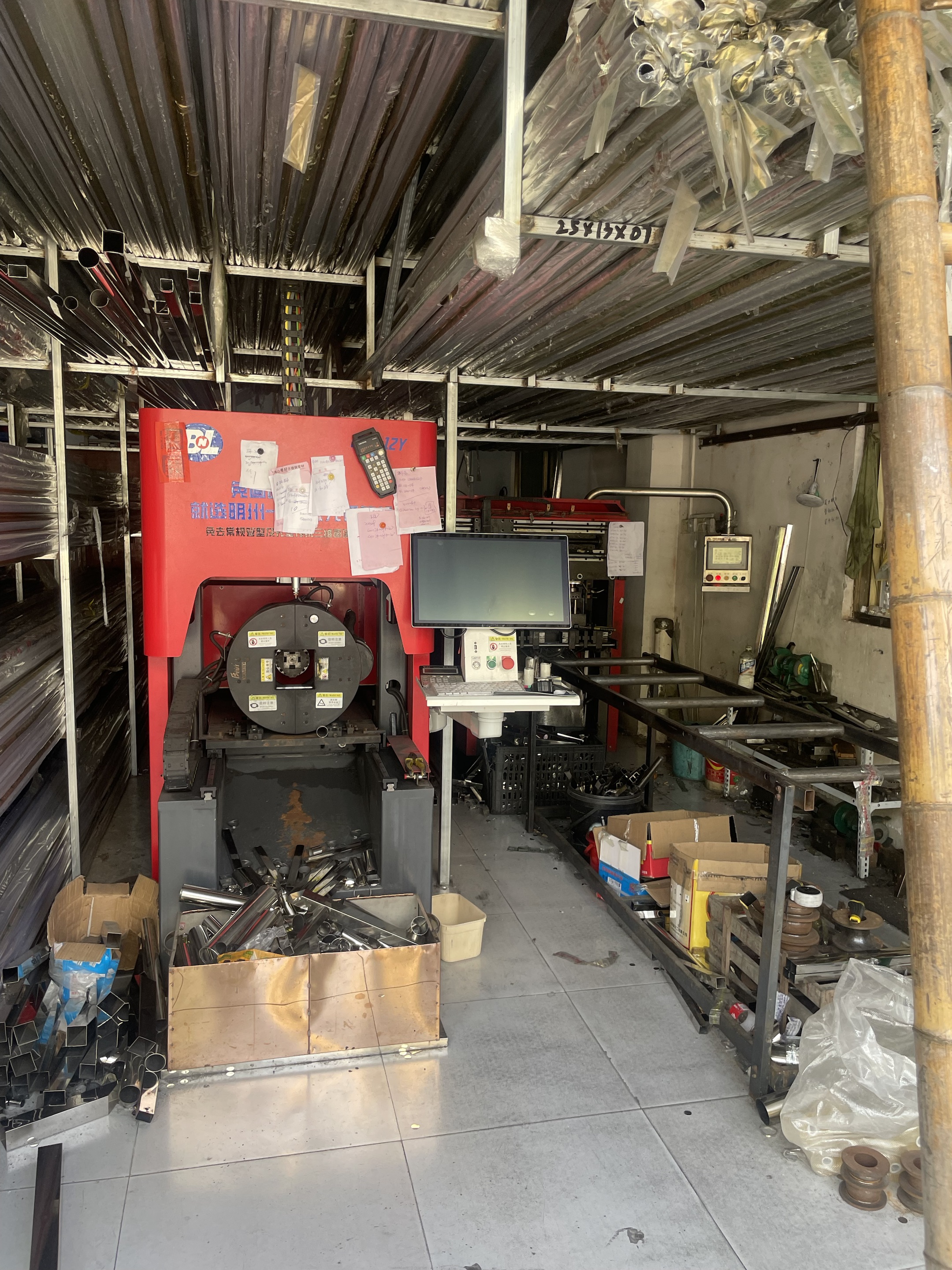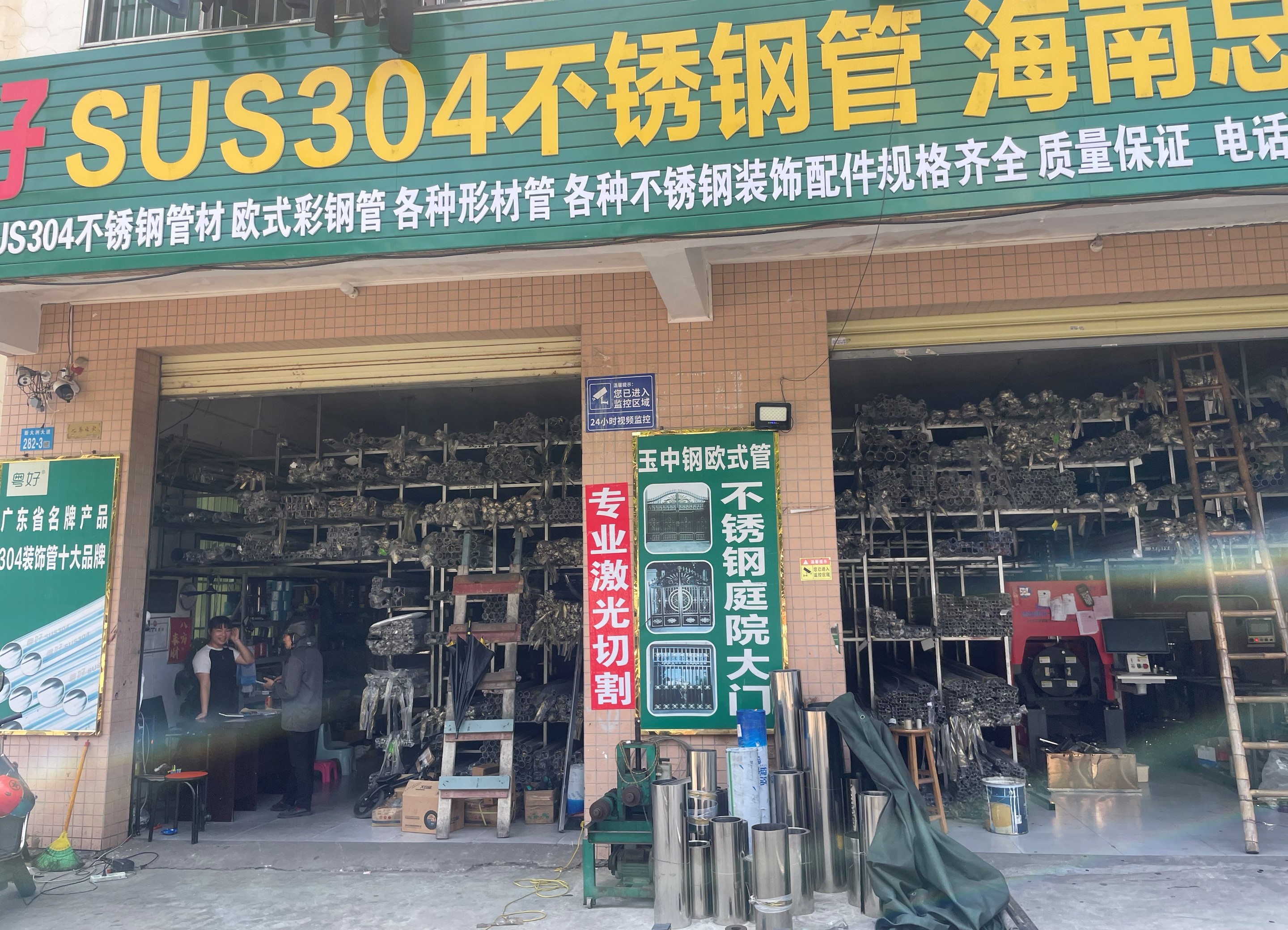 近日,明州激光劉總專程回訪了海南合作多年的老客戶。在這家看似不起眼的加工廠里,兩個門面雖小,卻藏著"大智慧"——上方貨架整齊碼放著各類管材,下方是一臺服役多年的沖孔機,而最引人注目的,是去年新引進的明州激光切管機。