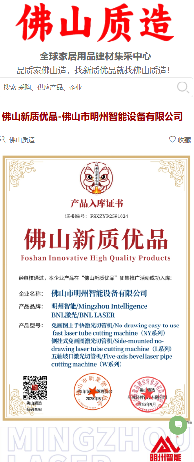 近日,經(jīng)嚴(yán)格遴選,“佛山新質(zhì)優(yōu)品”征集推廣活動(dòng)正式公布入庫(kù)名單,佛山市明州智能設(shè)備有限公司憑借多款高端激光切管設(shè)備成功入選,旗下“明州智能(Mingzhou Intelligence)”與“BNL激光(BNL LASER)”品牌產(chǎn)品獲認(rèn)證為佛山制造高質(zhì)量標(biāo)桿。此次入選,不僅是對(duì)明州智能技術(shù)實(shí)力與產(chǎn)品品質(zhì)的高度認(rèn)可,更是“佛山質(zhì)造”區(qū)域品牌推動(dòng)新質(zhì)生產(chǎn)力發(fā)展的生動(dòng)實(shí)踐。