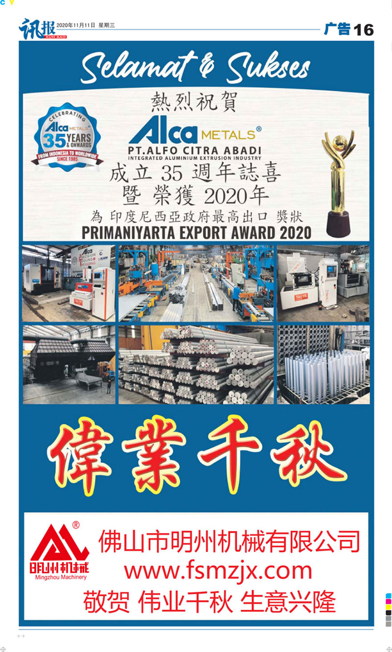 值此印度尼西亞合作伙伴ALCA金屬公司,成立35周年之際,佛山市明州機械有限責任公司董事長、總經理攜全體員工向你們表示最熱烈地祝賀!