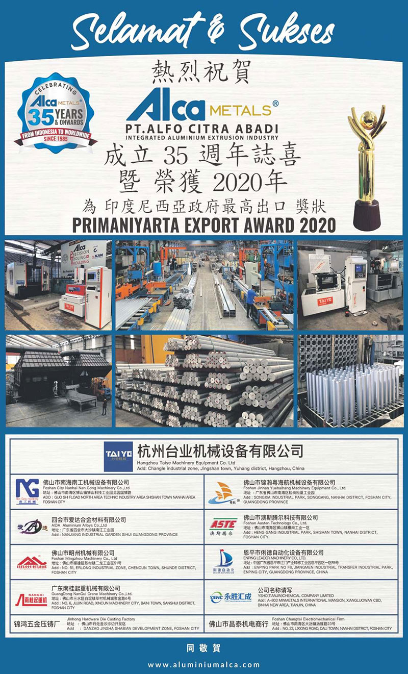 ALCA Metals 是一家綜合性鋁制造商,經歷了一個令人興奮的增長時期。該公司自 1985 年以來首次參與鋁市場,擔任鋁擠壓庫存商、鋁承包商 /制造商,以及印度尼西亞第一家 ALFO 門(鋁折疊門)生產商。 隨著其在世界各地的鋁擠壓營銷網絡的迅速增長,ALCA 于 1991 年在印度尼西亞啟動了第一家鋁擠壓和粉末涂層綜合工 廠。 ALCA 位于蘇門答臘島北部 Deli Serdang,距離 PT80 公里。 INALUM(印度尼西亞唯一的鋁錠冶煉廠),ALCA 在 250.000 平方米的廠房內運作,員工超過 1.200 人,生產能力為 60.000 噸鋁/年。ALCA 金屬 1 自 1990 年以來,產品平均分配到印度尼西亞市場,覆蓋蘇門答臘島、爪哇島、加里曼丹島和蘇拉威西 島。 ALCA Metals 的產品還出口到 4 個大陸(澳大利亞、 歐洲、美洲和非洲),覆蓋世界 20 多個主要城市。